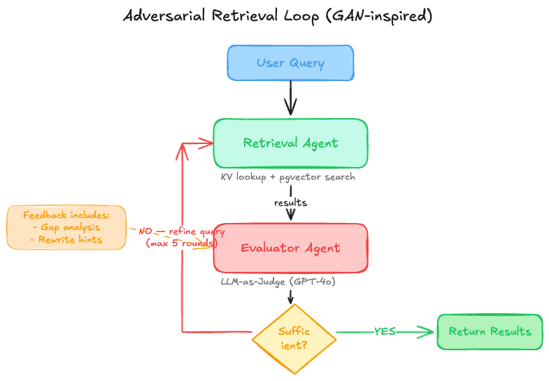z0 的检索层借鉴了 GAN 的思路,但不是图像生成意义上的 GAN,而是对抗式评估这个核心机制:一个 Agent 负责检索(Generator),另一个 Agent 负责评估当前检索结果是否足以回答问题(Discriminator)。