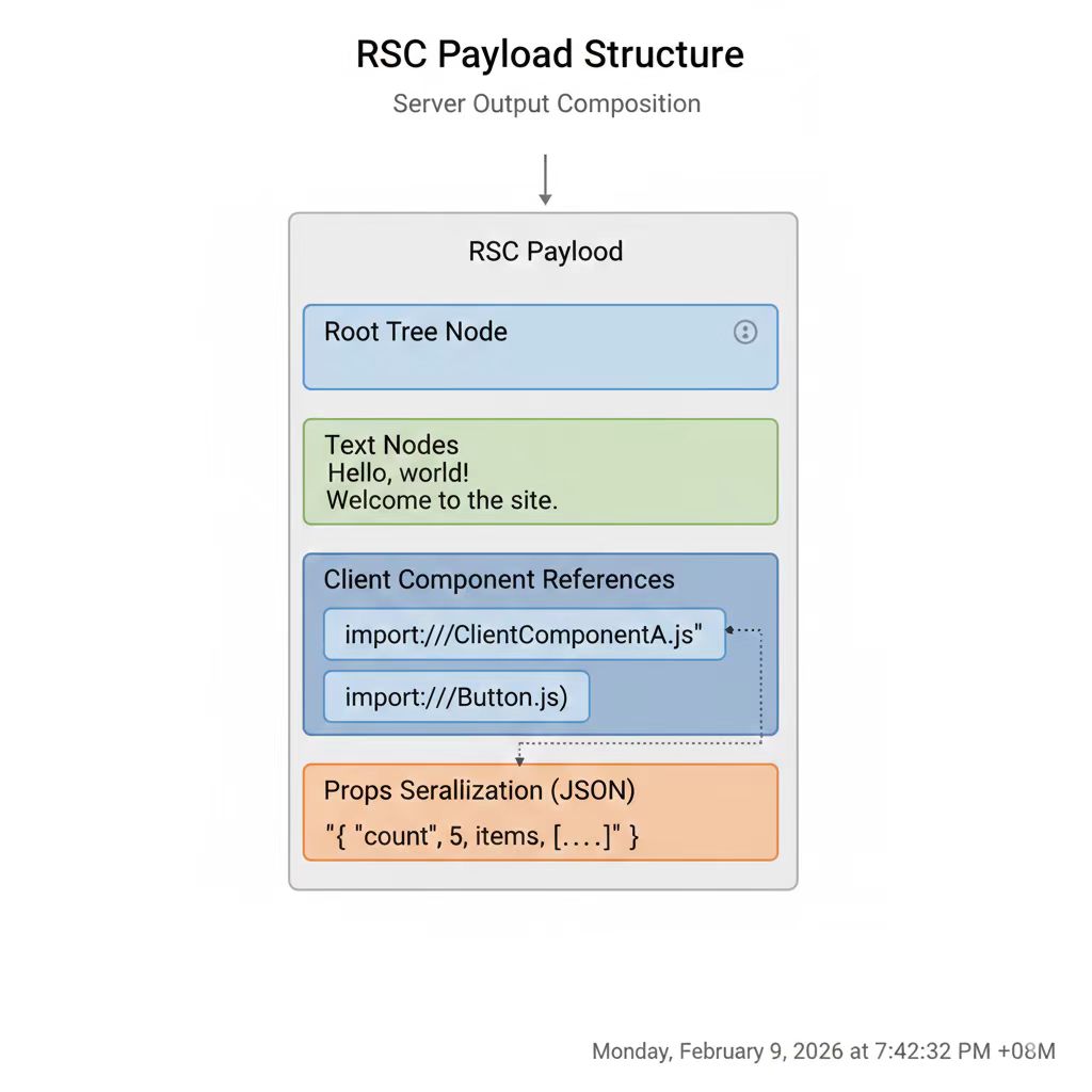 为什么不是 HTML? HTML 是 DOM 语义,不是组件语义。一段 HTML 里你无法区分"这是 Server Component 的输出"和"这是 Client Component 的占位"。React 需要在浏览器侧精确地知道哪些节点已经由服务端计算完成、哪些需要客户端接管,HTML 表达不了这个信息。