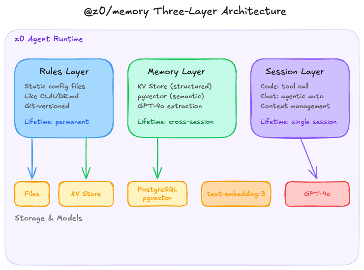 图2:@z0/memory 的三层架构,对应系统规则、长期记忆和会话记忆。