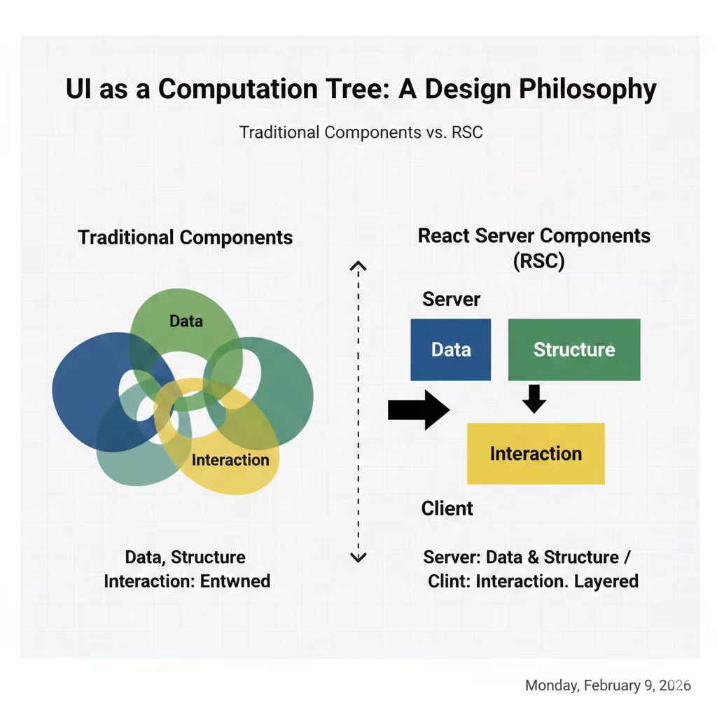 这些哲学并不是抽象口号,它们直接改变你对 UI 的组织方式。RSC 把"结构"与"交互"分离,把"数据计算"从"视觉声明"里抽出来,让 UI 变成一棵可推理的树。Server Components 是数据驱动的结构,Client Components 是交互驱动的容器,这不是分工建议,而是架构约束。