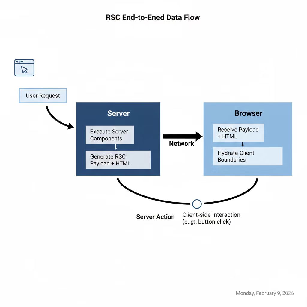 图2:RSC 端到端数据流——请求、服务端执行、payload/HTML、客户端 hydration 与 action 回写。
