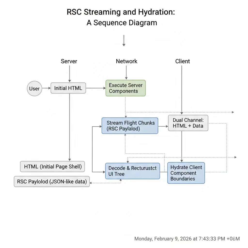 服务端执行 Server Components 后,生成一份 RSC payload(下一节详细拆解其 wire format)。客户端接收这份 payload,只对 use client 边界内部进行 hydration——客户端并不"重建整棵树",而是"补全边界内的交互"。